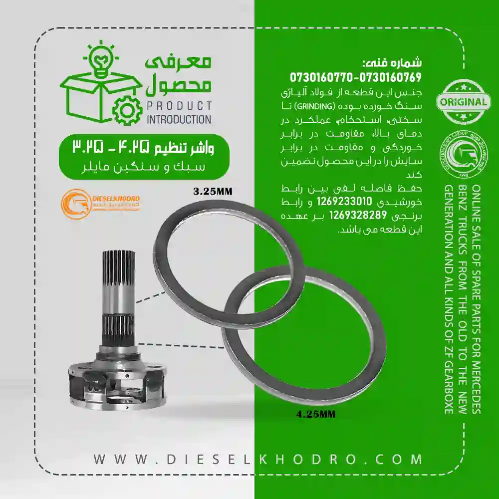 این واشر تنظیم با ضخامت 3.25 میلیمتر از فولاد یا آلیاژ سبک با سختی 30-40 HRC ساخته شده و با فرآیند سنگزنی برای تنظیم دقیق فاصله در سیستم انتقال قدرت وسایل نقلیه مایلر طراحی شده است. دارای تلرانس ابعادی ±0.01 میلیمتر است. این واشر در برابر فشار مقاوم بوده و با پوشش ضدخوردگی محافظت میشود.