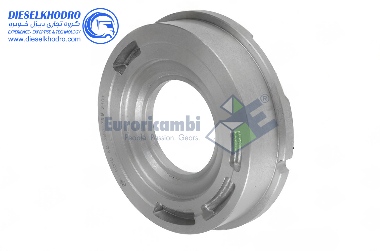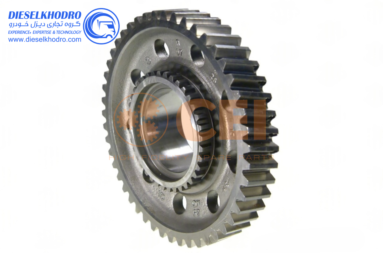 توضیحات کلی: این قطعه، دنده سرعت ششم گیربکس است و با 55 دندانه، وظیفه انتقال قدرت در سرعتهای بالای جادهای را دارد. این دنده معمولاً به صورت دنده ثابت (Constant Mesh) عمل کرده و درگیر شدن آن از طریق بوش سنکرون انجام میشود. به دلیل سرعت بالای چرخش در این دنده، کیفیت ماشینکاری سطح تماس آن باید در بالاترین سطح باشد تا عمر مفید آن تضمین گردد. مقاومت در برابر خستگی سطحی (Pitting) به دلیل بارهای مداوم در سفرهای طولانی، یک ویژگی کلیدی در این قطعه یدکی است.