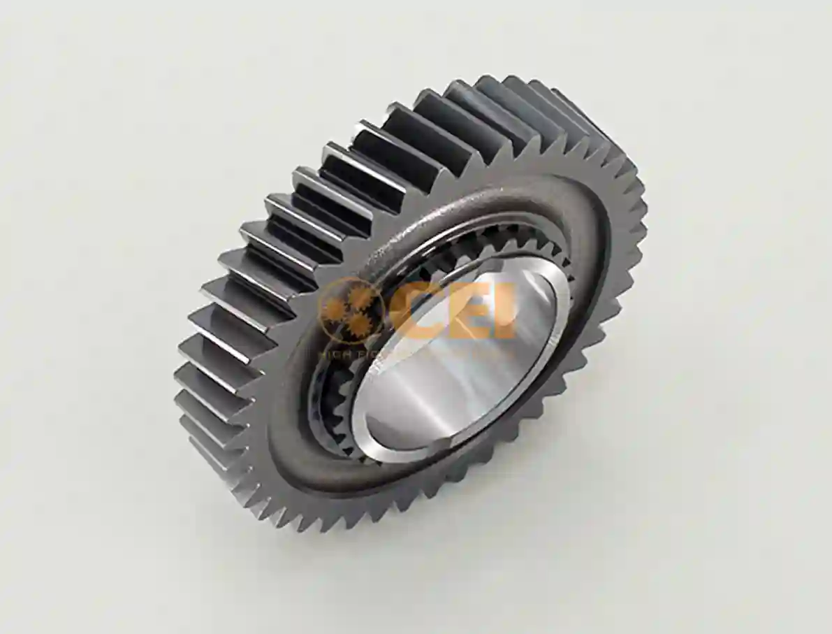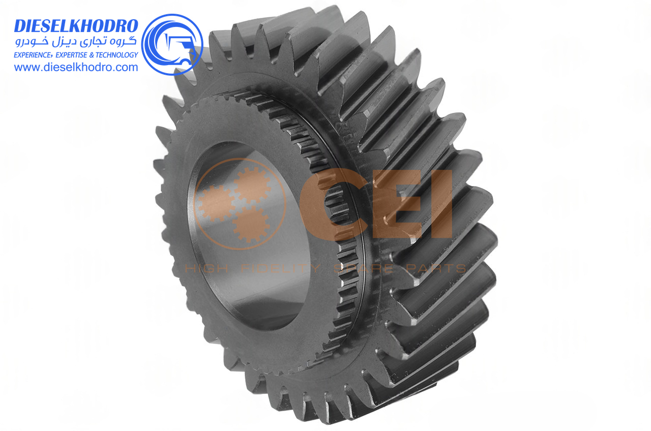 توضیحات کلی: این دنده بزرگ 39 دندانهای، دنده متحرک دنده عقب است که روی شافت اصلی نصب میشود. در بسیاری از گیربکسها، دنده عقب معمولاً از نوع دنده ساده (Herringbone یا Spur Gear) است و با یک واسطه (Idler Gear) بین شافت اصلی و کندرو درگیر میشود. به دلیل استفاده نادر از دنده عقب، سایش اصلی بر روی دندههای جلو است، اما دنده عقب باید در برابر خوردگی ناشی از رسوب مواد یا روغن با کیفیت پایین مقاوم باشد.